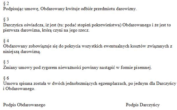 W przypadku umowy darowizny samochodu lub nieruchomości w umowie muszą się znaleźć oświadczenia darczyńcy o posiadaniu prawa własności samochodu/nieruchomości i o braku obciążeń samochodu/nieruchomości zobowiązaniami na rzecz osób trzecich. Należy również zamieścić oświadczenie o przekazaniu darowizny przez darczyńcę i jej przyjęciu przez obdarowanego. Trzeba też określić termin przekazania darowizny. Jeśli zaś w rachubę wchodzi darowizna środków pieniężnych, to musi być ona udokumentowana albo wyciągiem z konta bankowego, albo pokwitowaniem przesłania pieniędzy przekazem pocztowym.